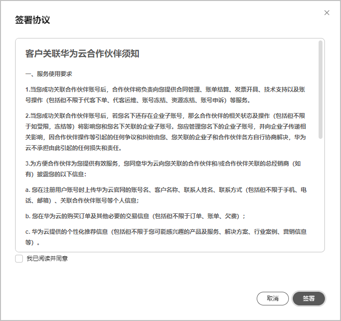 客户关联华为云合作伙伴须知协议请以最新更新的版本为准。历史签署版本请到官网资料的历史版本里查看。