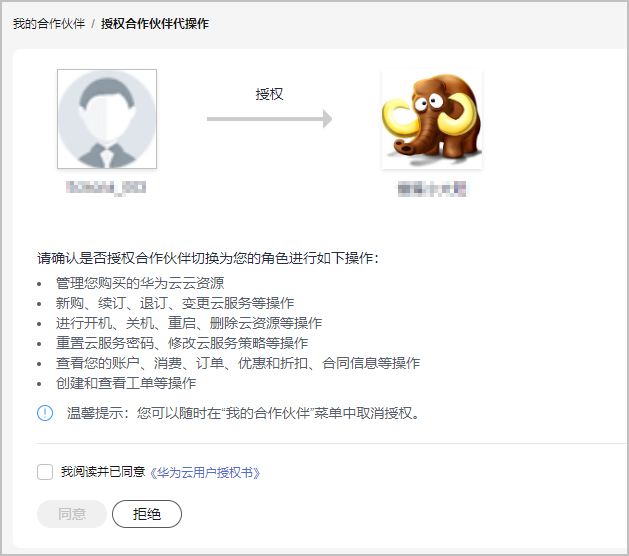 - 勾选“我阅读并已同意《华为云用户授权书》”,单击“同意”。