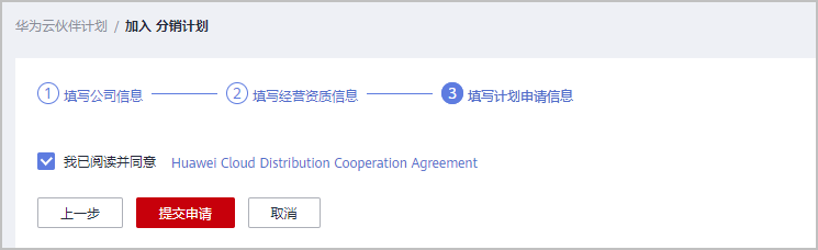 - 勾选“我已阅读并同意 Huawei Cloud Distributor Cooperation Agreement”,单击“提交申请”。