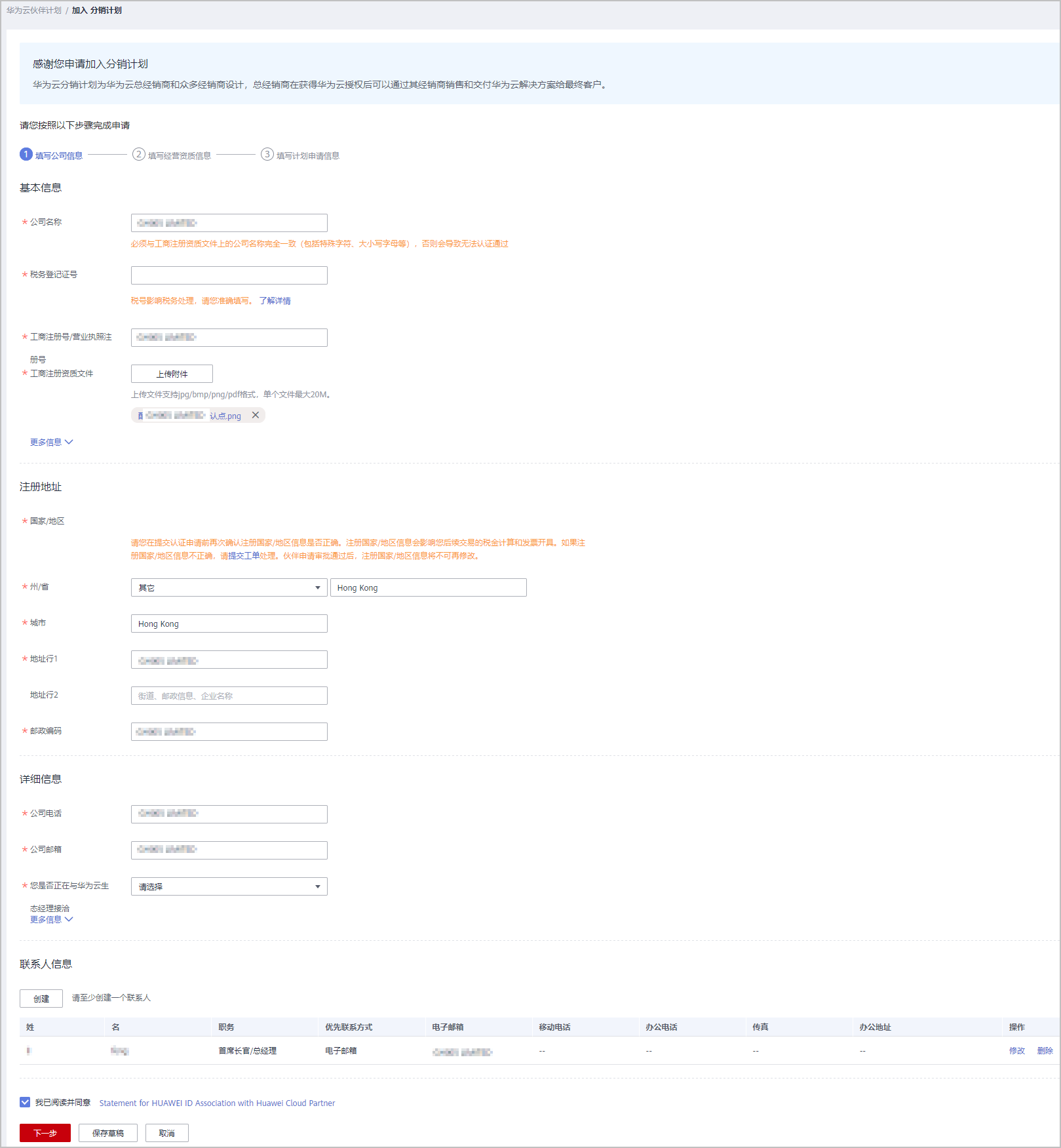 填写公司信息,并勾选“我已阅读并同意《Statement for HUAWEI ID Association with Huawei Cloud Partner》”,单击“下一步”。