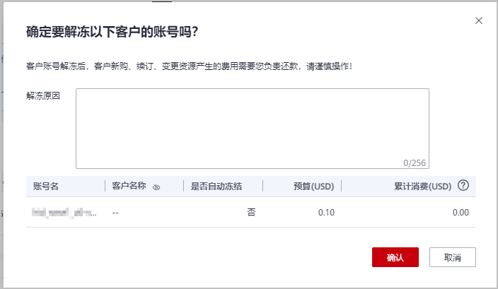 5. 输入“解冻原因”,单击确认。系统提示解冻账号成功的系统提示。
