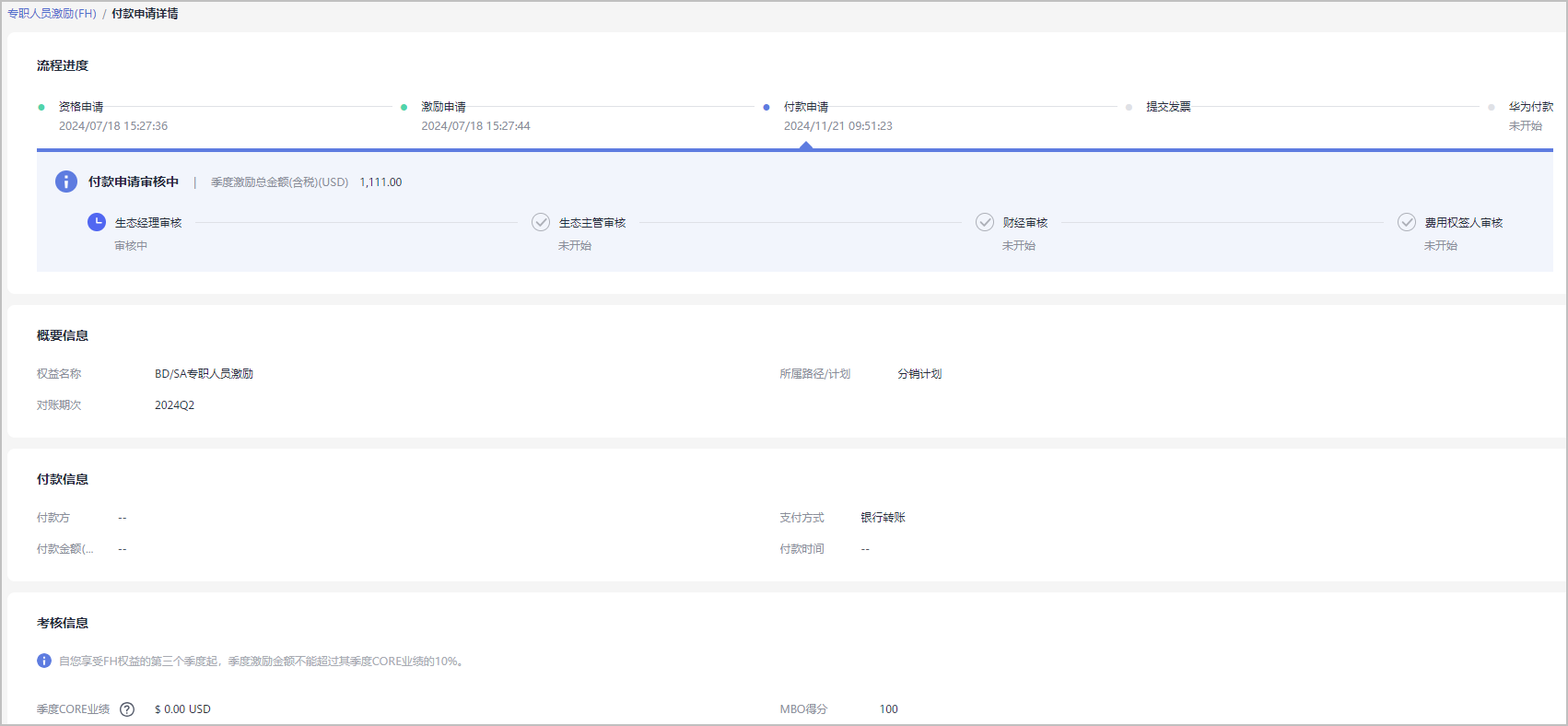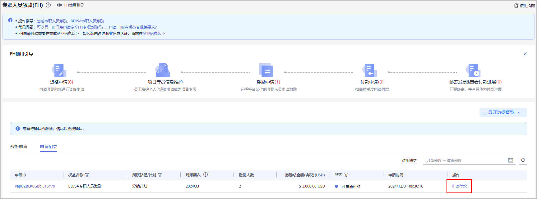 一个季度内的激励全部定稿后,伙伴可以发起季度付款申请。