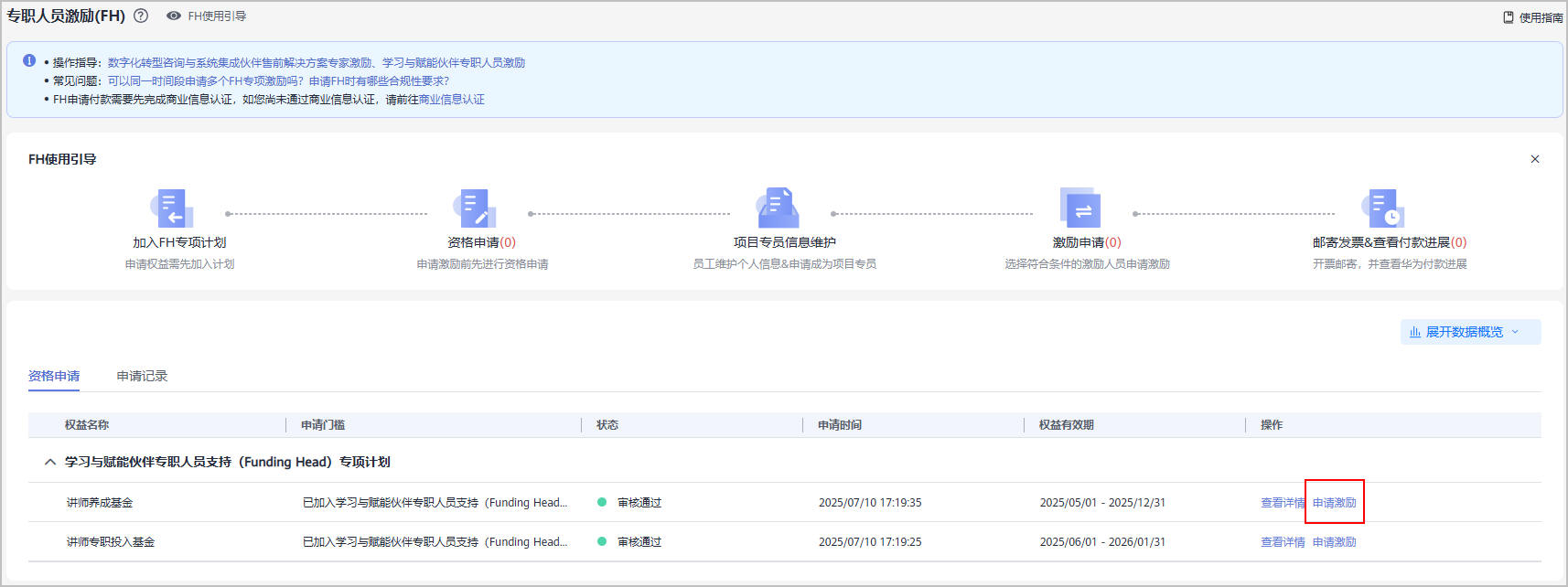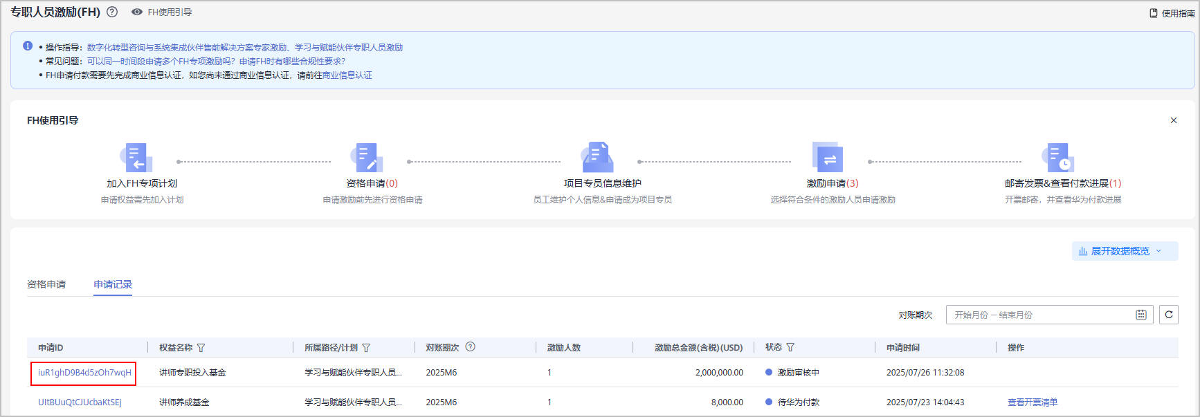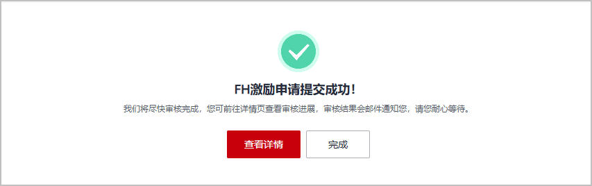- 确认并提交激励申请后,系统提示FH激励申请提交成功,请等待华为云审核。