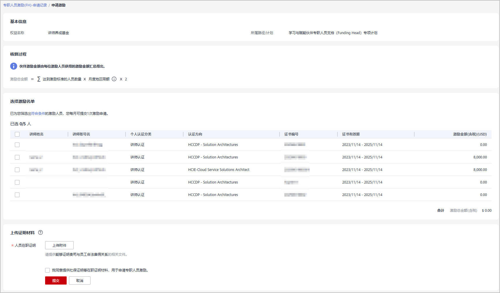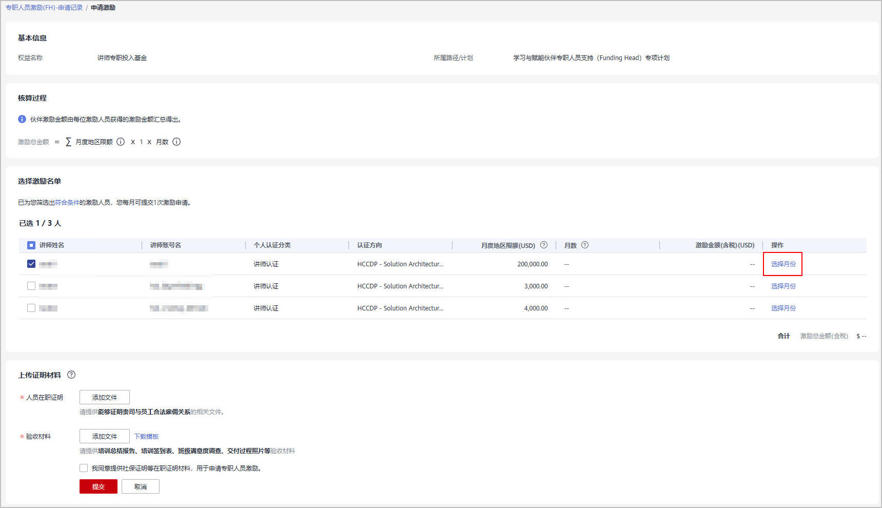 - 在申请激励页面,选择激励人员名单并上传证明材料。