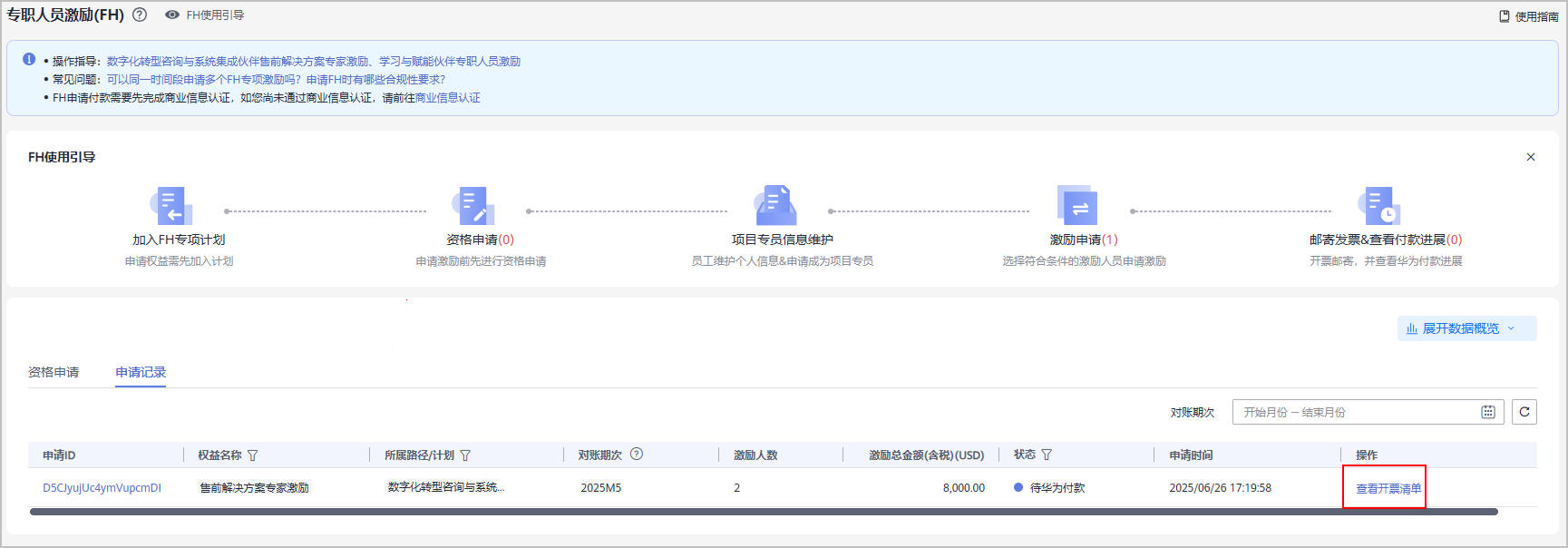 - 在“申请记录”页签中,选择状态为待华为付款的激励,单击操作列的“查看开票清单”。