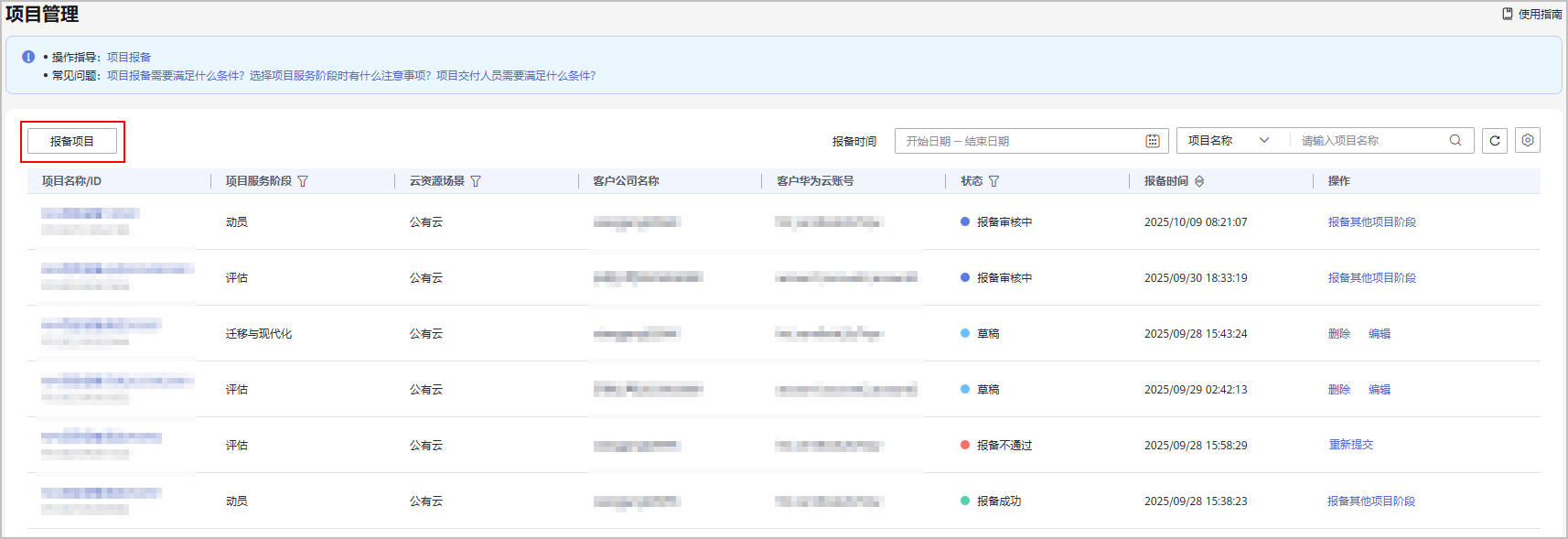 - 进入报备项目页面填写项目信息,包括项目基本信息、客户信息、项目云资源信息、项目预估信息、华为侧联系人信息。