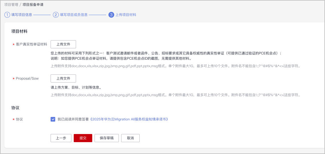 - 上传项目报备材料并勾选协议后,单击“提交”。