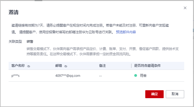 系统自动给被邀请客户发送邀请邮件,客户收到邮件后,单击邮件中的链接进行注册和关联,具体操作请参见客户点击邀请链接关联伙伴操作指导。