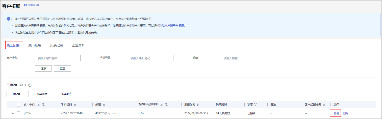 - 在客户列表中,选择一条客户信息,单击“操作”列的“邀请”。