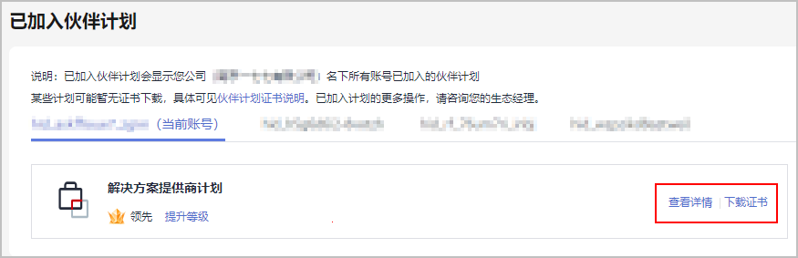 - 单击伙伴计划后的“下载证书”,可下载对应的伙伴计划证书。