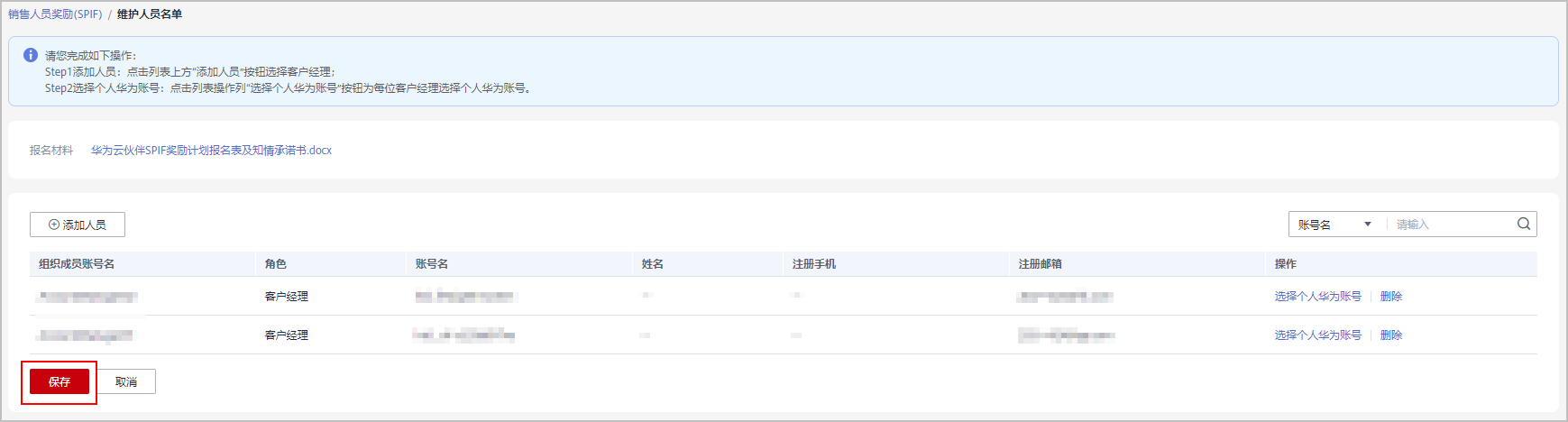 - 添加成员并选择个人华为账号后,单击“保存”,系统提示人员名单维护成功。