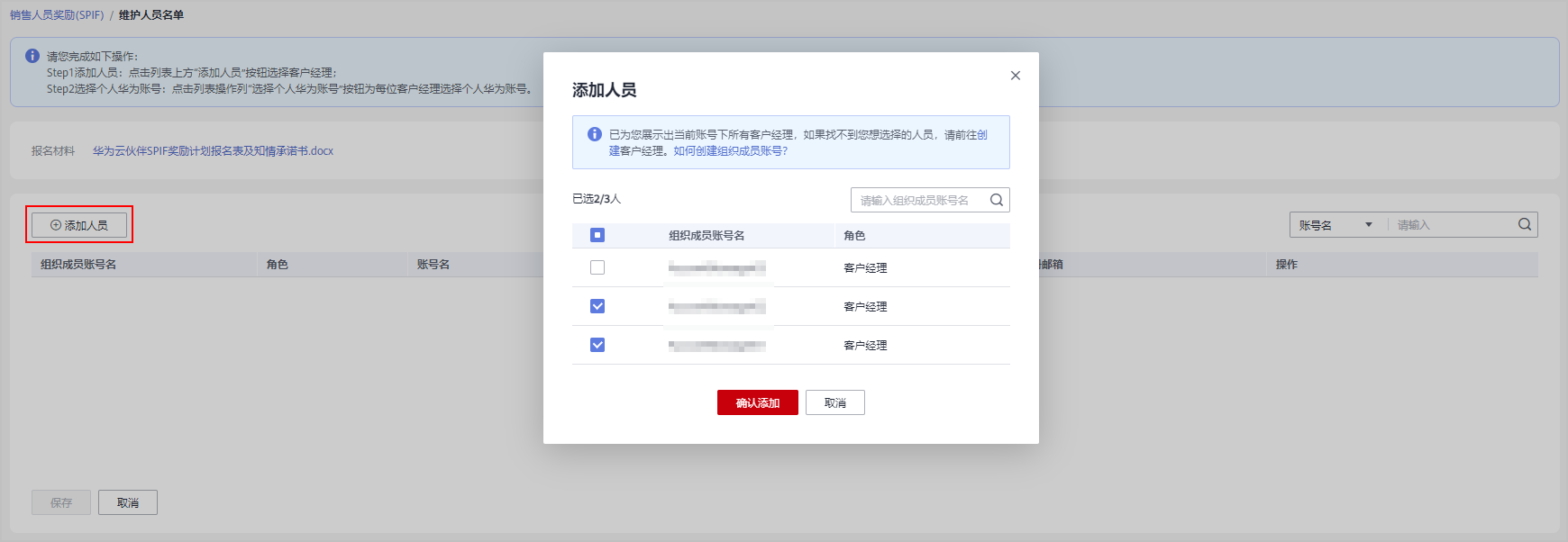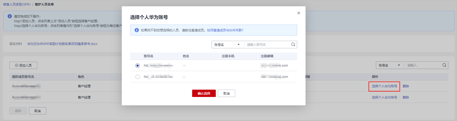 - 单击操作列的“选择个人华为账号”,为已选择的客户经理添加个人华为账号。