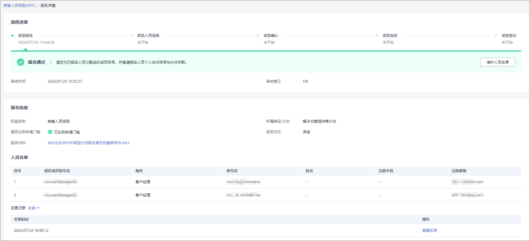 - 在奖励报名页签中,单击“申请详情”可查看人员名单及变更记录;