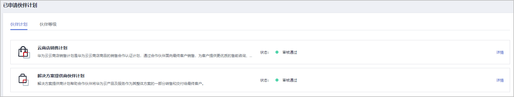 - 选择“伙伴计划”页签,单击“详情”,可以查看已申请的伙伴计划的详情,包括申请状态,申请要求信息等。