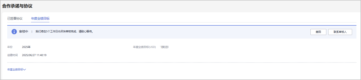 在“年度业绩目标”页面显示业绩目标在审核中。