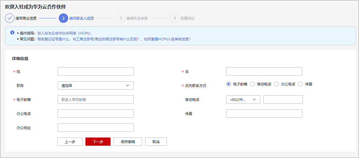 - 首次入驻:在“欢迎入驻成为华为云合作伙伴”页面填写商业信息,单击“下一步”。