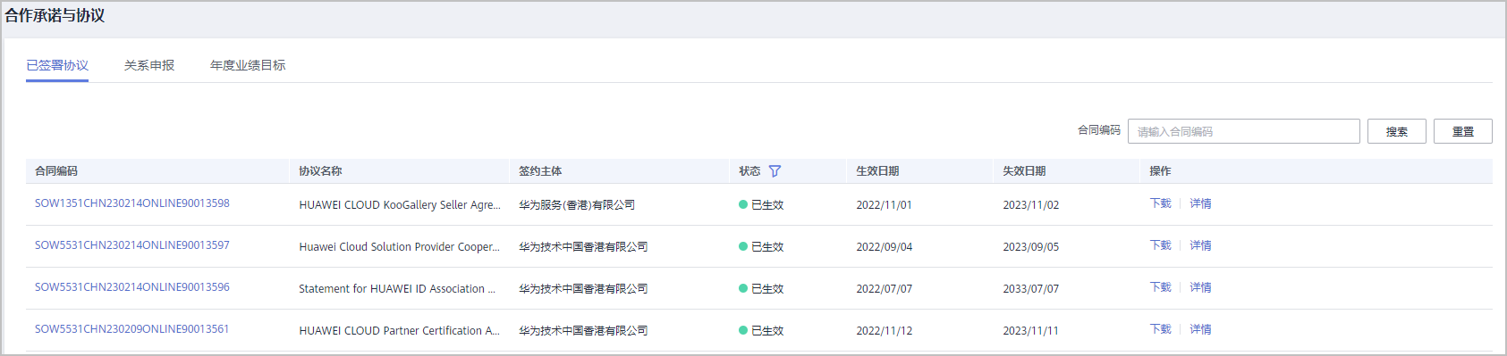 - 单击“操作”列的“下载”,可以下载已签署的协议。