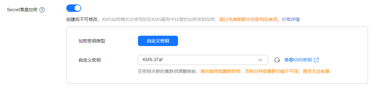 - 开启Secret落盘加密功能时,请勿使用DEW的控制台或OpenAPI禁用或删除创建集群时选择的密钥,否则会导致集群API Server不可用,影响业务应用的正常运行。