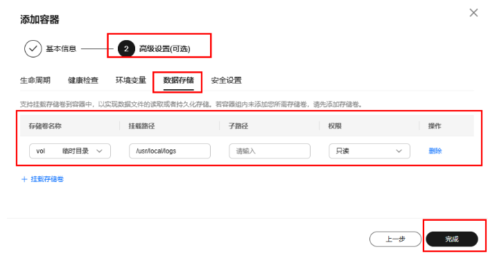 - 配置高级设置,添加数据存储卷,选择3创建的临时目录卷。