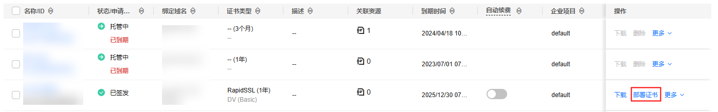- 在目标证书所在行的“操作”列,单击“部署证书”,系统从右面弹出证书部署详细页面,如图1所示。