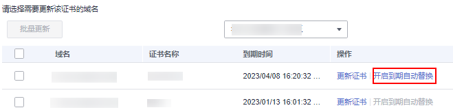 - 选择需要开启到期自动替换的域名,并单击“操作”列的“开启到期自动替换”。