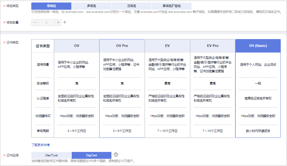 - “证书类型”和“证书品牌”选择后,“域名数量”、“有效期”、“购买量”将自动生成,无需配置。