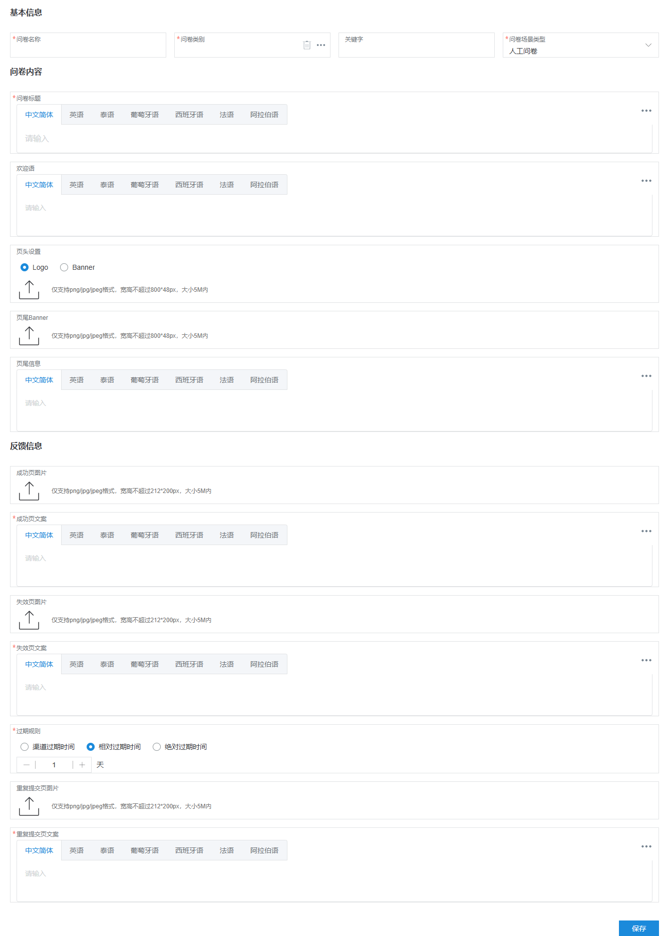 - 语言的种类由下“问卷支持的语言”参数设置。