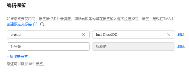 如果有多台云服务器或其他云资源需要添加同一标签,为了避免重复输入标签键和值,您可以在标签管理服务中预定义标签,然后在添加标签时直接选择键和值。具体步骤如下: