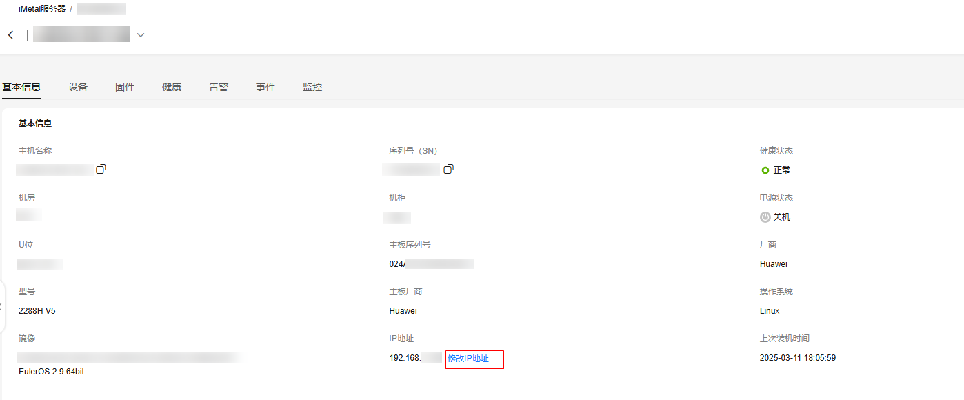 - 在iMetal服务器的“基本信息”页签,单击“IP地址”后面的“修改IP地址”。