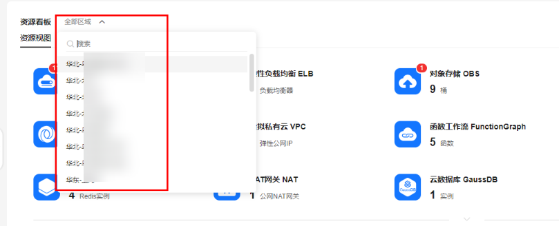 - 单击“全部区域”自定义筛选指定区域查看该区域下的资源。