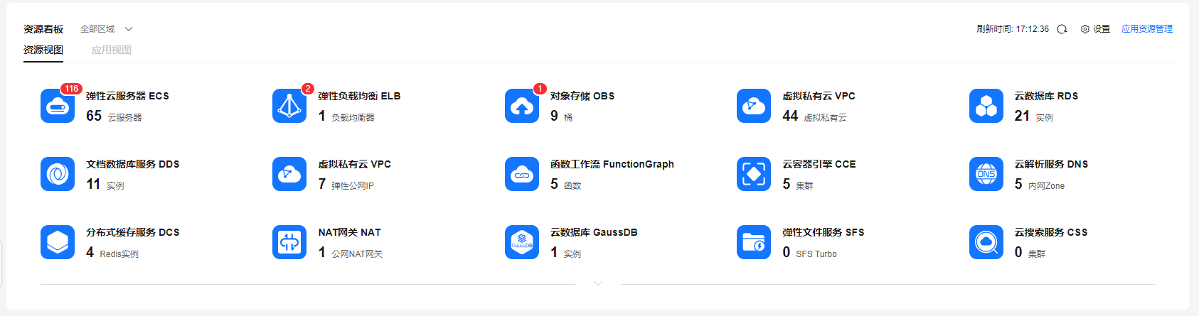 您可以在资源看板快速查看账号下购买的资源(例如弹性云服务器、弹性公网IP、云数据库等),以及资源当前的告警信息(在云监控服务CES配置后产生)。