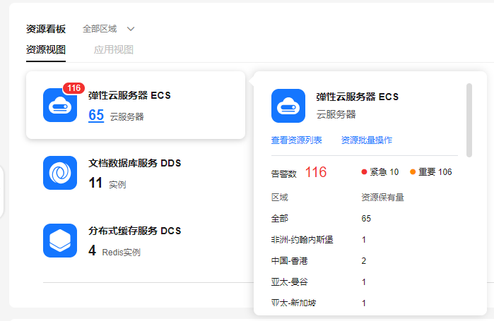 展示紧急/重要告警数量,和资源实例的区域分布。云服务图标右上角红底数字代表告警数量。图3 鼠标悬停查看资源