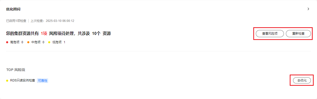 您可以在云运维中心总览页快速查看资源风险项,该功能使用优化顾问OA服务,提供大量检查项能力和优化建议,例如ECS实例规格检查,资源实例或集群是否开启自动备份等。