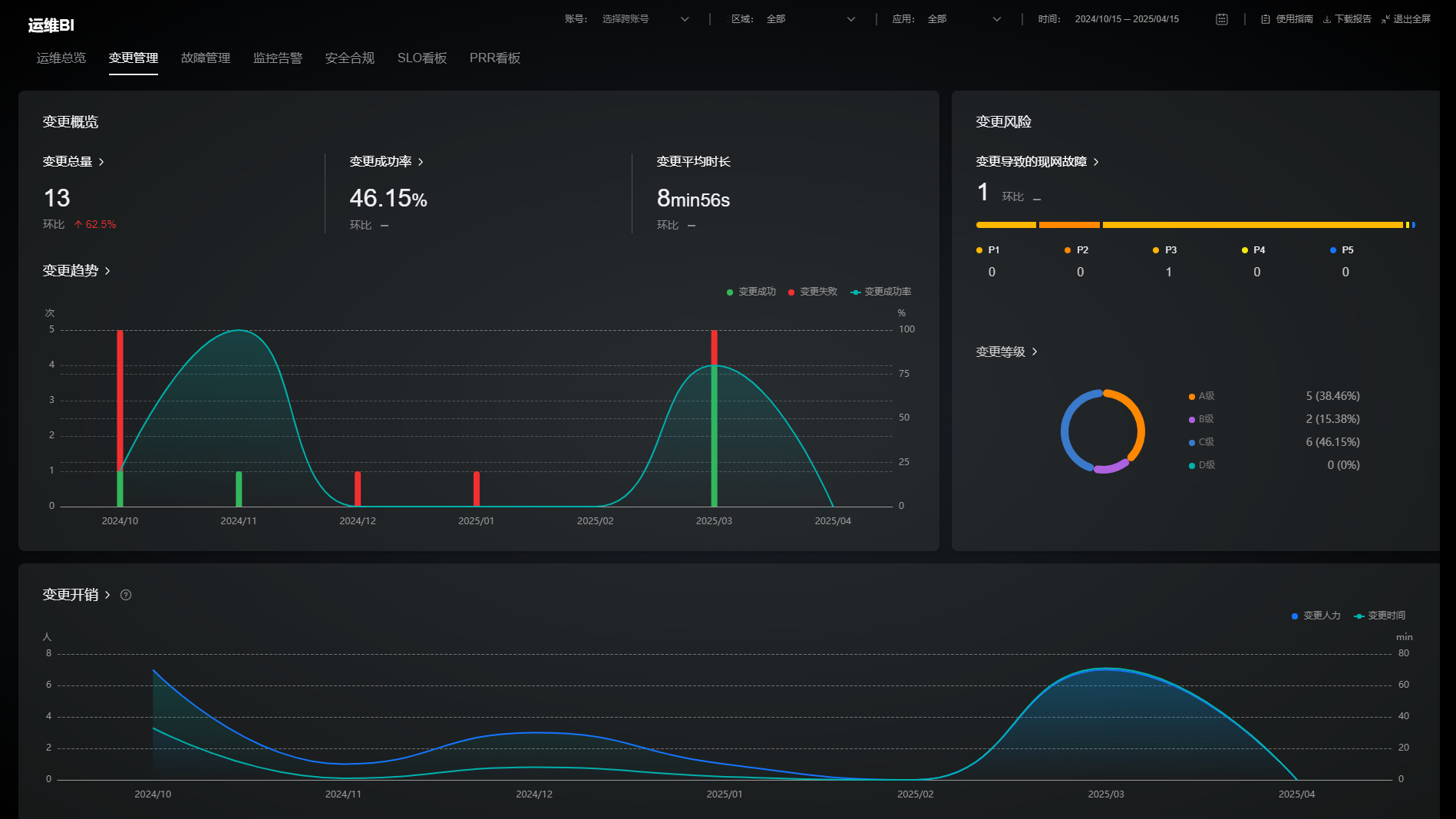 变更管理包含变更概览、变更开销、变更风险三个模块,全方位呈现变更核心指标。数据概览中包含变更平均时长、成功率等指标,通过环比和趋势图体现变更整体情况。变更风险根据变更等级分布图,分析变更导致的故障。变更开销统计变更人力和时间趋势,有效控制变更成本。指标详情可查看表2。