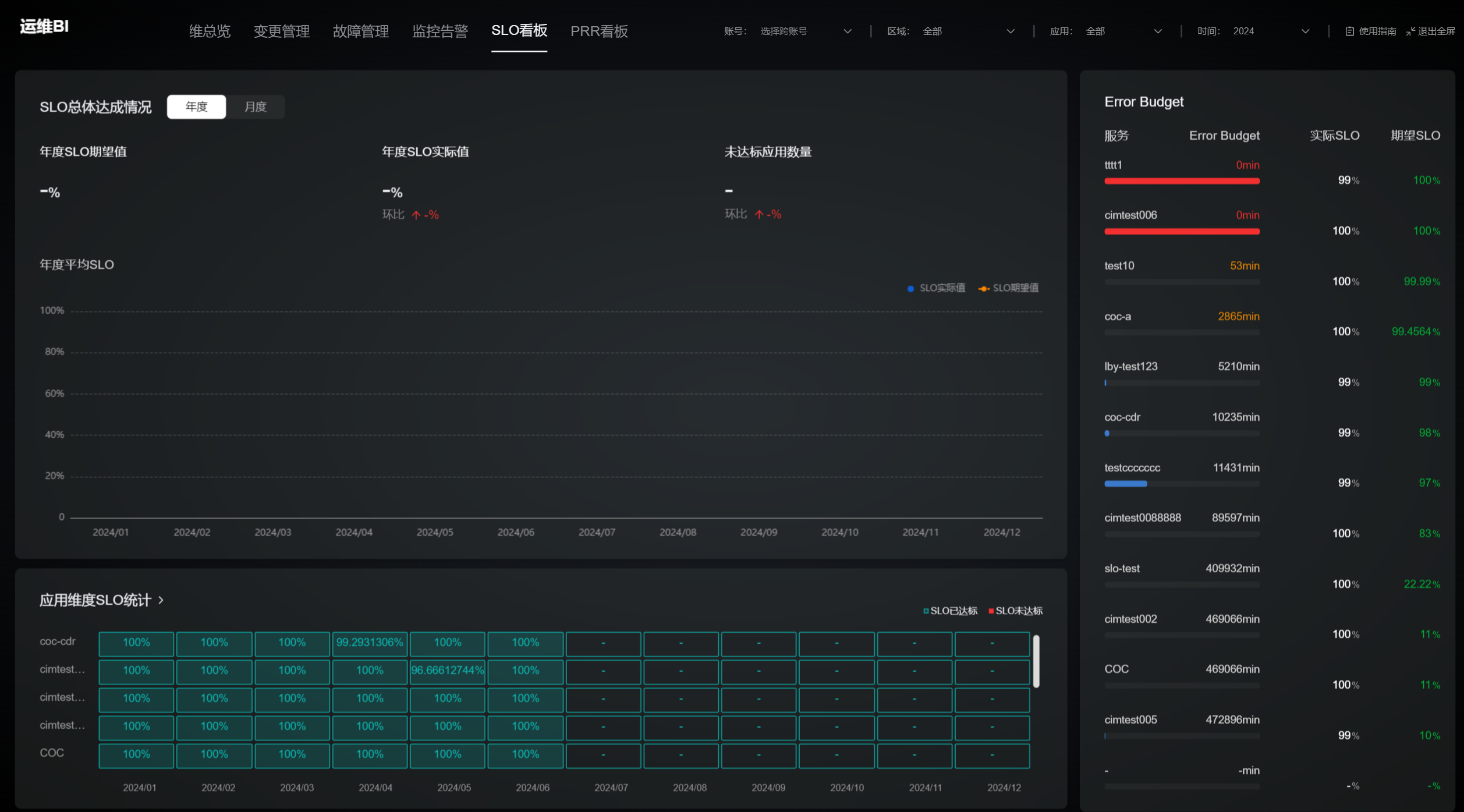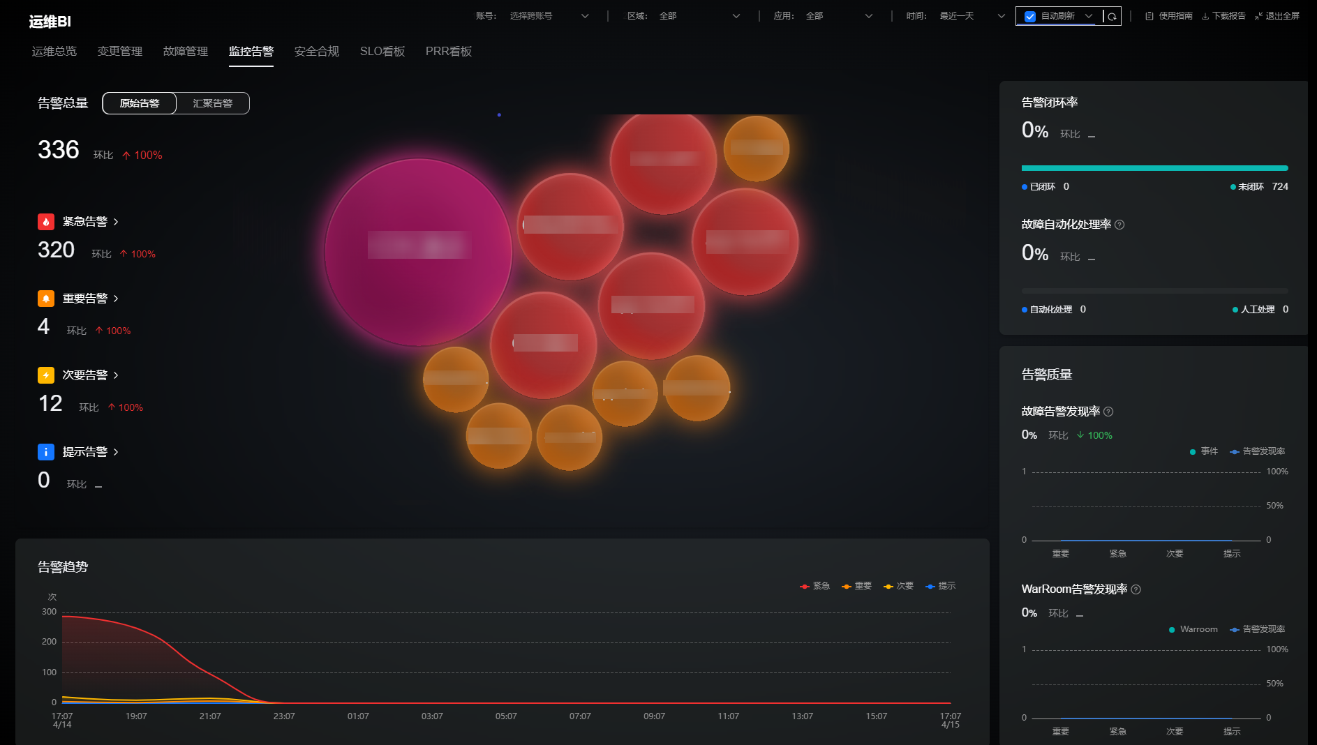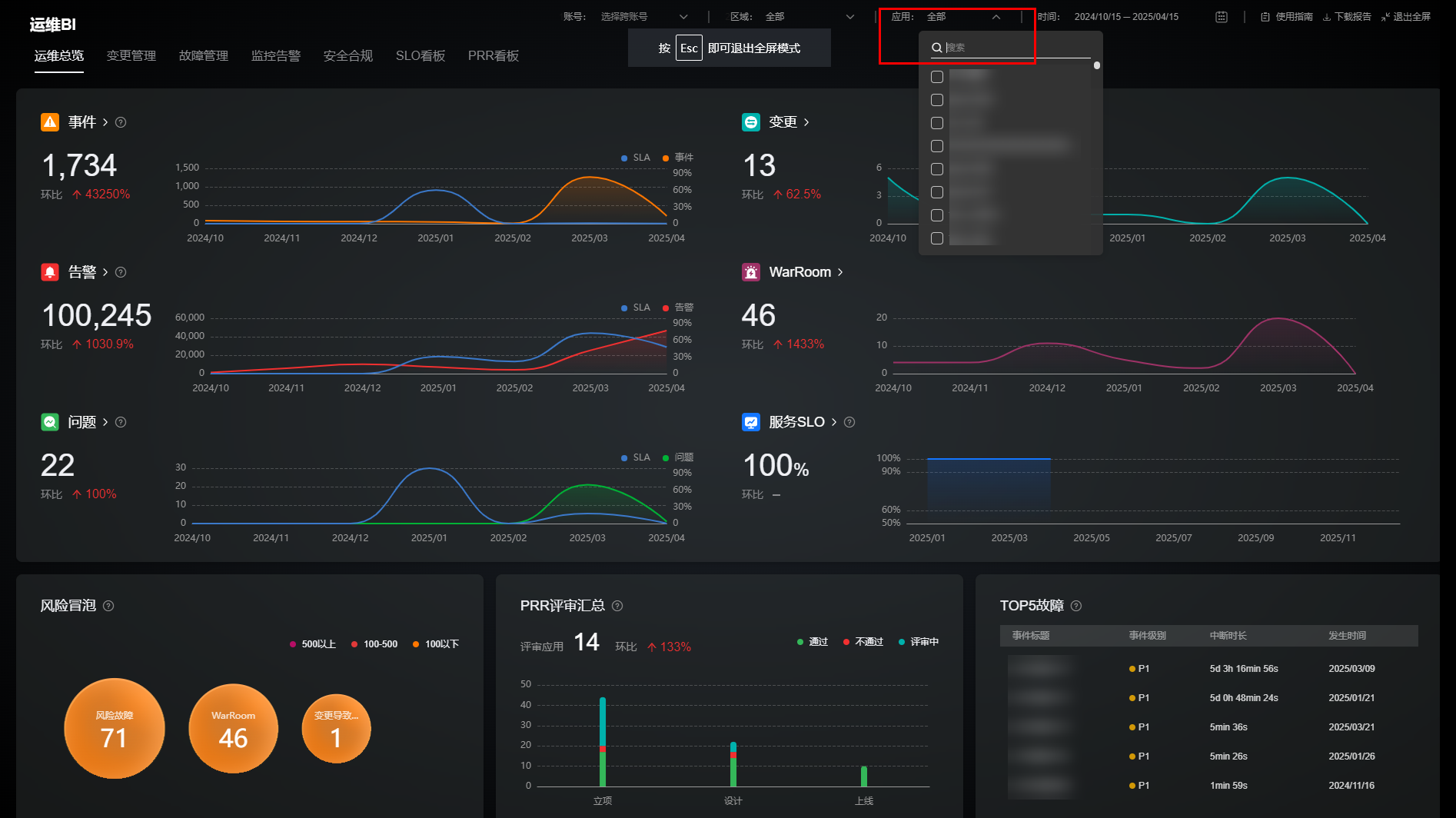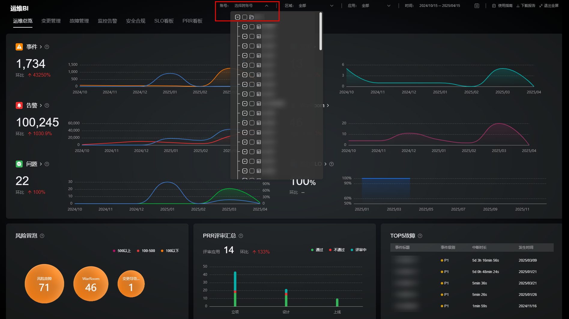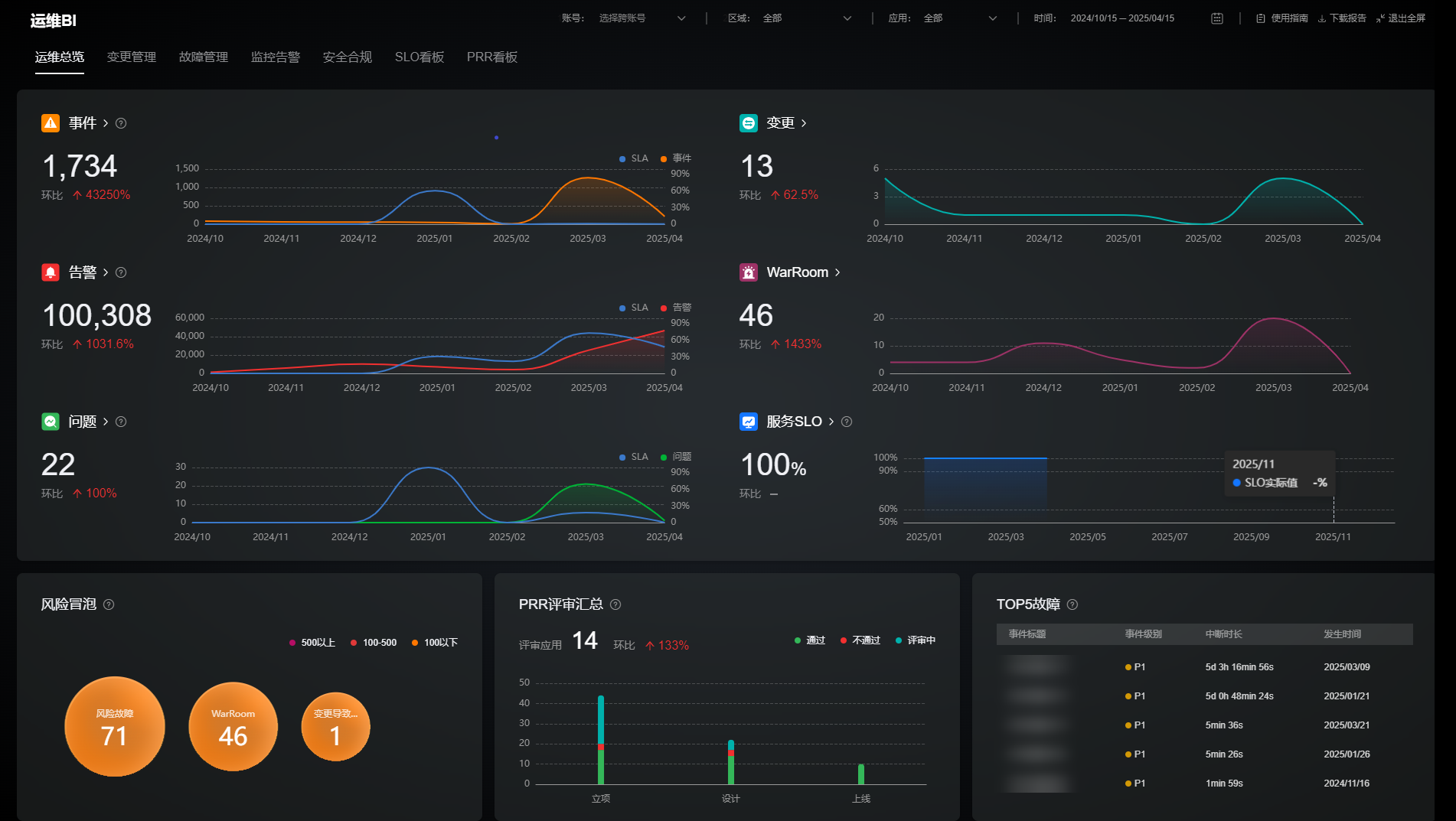 云运维中心提供运维BI的能力,包含变更、事件、告警、安全合规、SLO(服务级别目标)、PRR(生产准备度评估)等多种运维指标数据,从宏观到微观全面呈现运维全局态势,提供企业级运维沙盘。