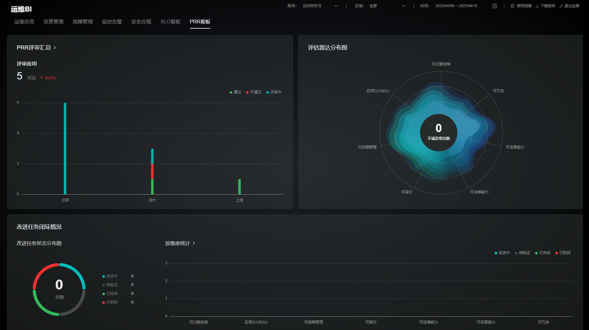 包括运维总览、变更管理、故障管理、监控告警、安全合规、SLO看板和PRR看板七大核心模块,各看板功能定位与指标说明如下: