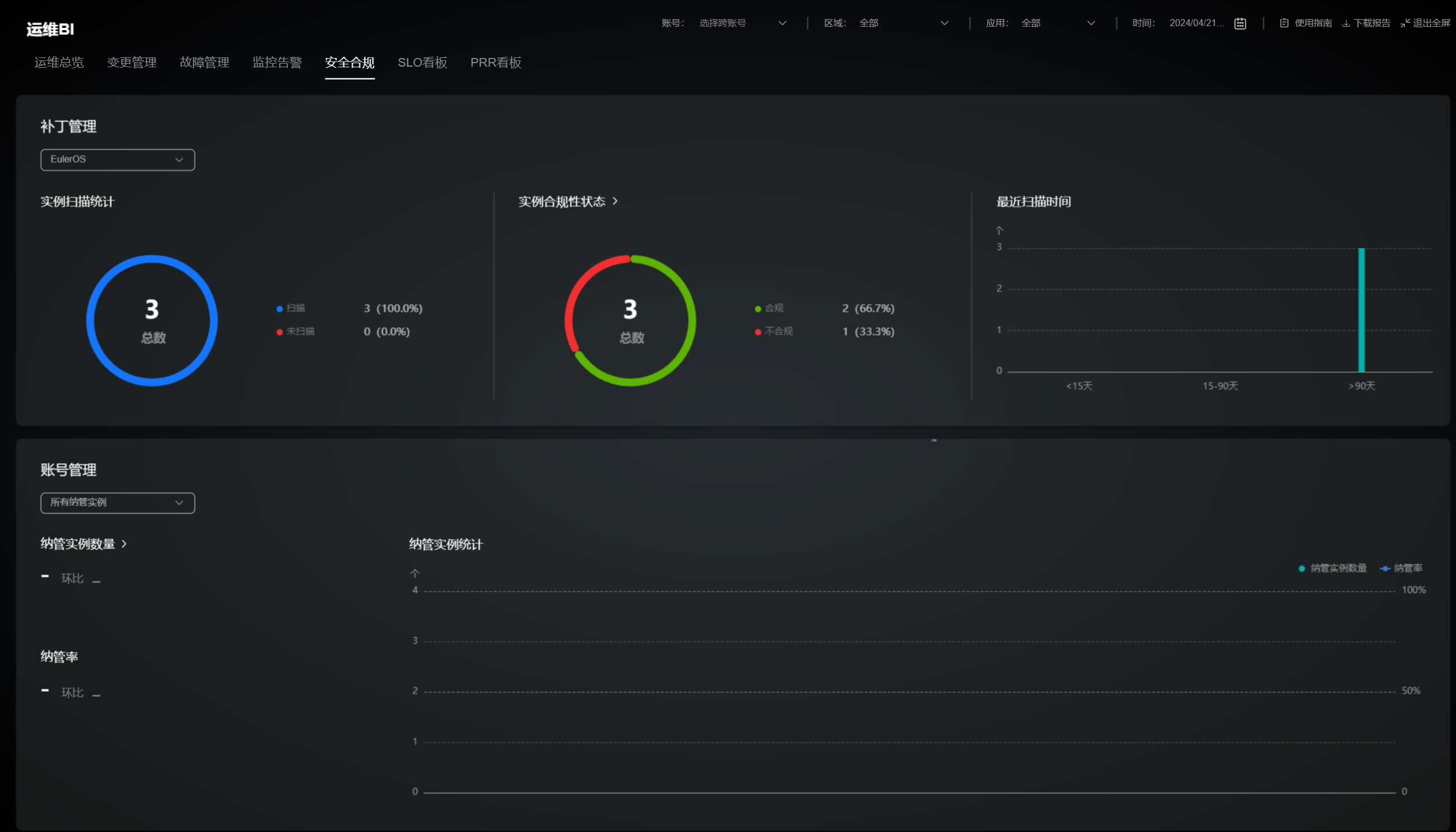 安全合规包含补丁扫描数量统计和账号纳管数据统计。补丁扫描支持按照区域、应用和操作系统维度查看实例合规数据、按时间段范围展示实例已扫描数量统计。