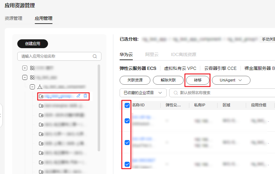 - 在左侧应用栏,展开应用,选择分组,勾选需要转移的资源,单击“转移”。