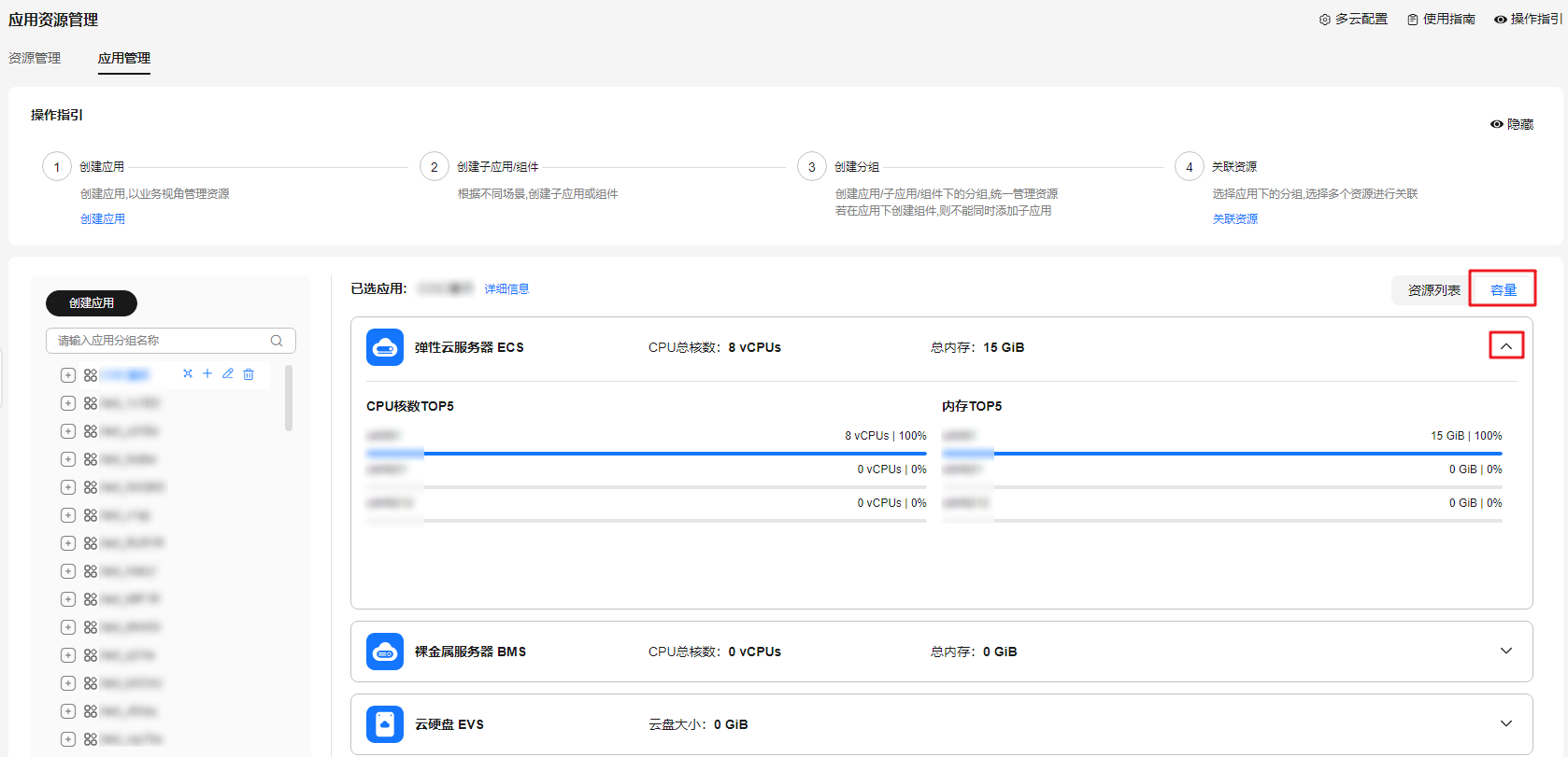 - 在左侧应用栏,选择需要查看的应用、子应用、组件或分组,单击右侧“容量”。