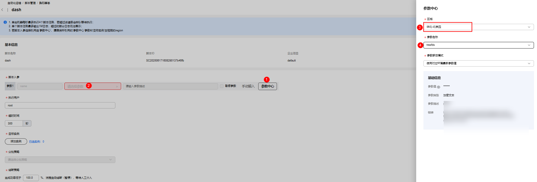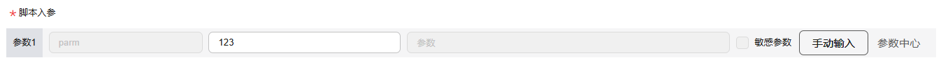 - 脚本入参:脚本入参在录入自定义脚本时已预置好参数名称与参数默认值。脚本执行时,脚本入参值支持“手动输入”和“参数中心”两种方式。“手动输入”方式需要用自行填写参数值;“参数中心”方式,需要从参数中心选择预置好的参数值,请注意选择参数所在区域、参数名称和参数联动模式。