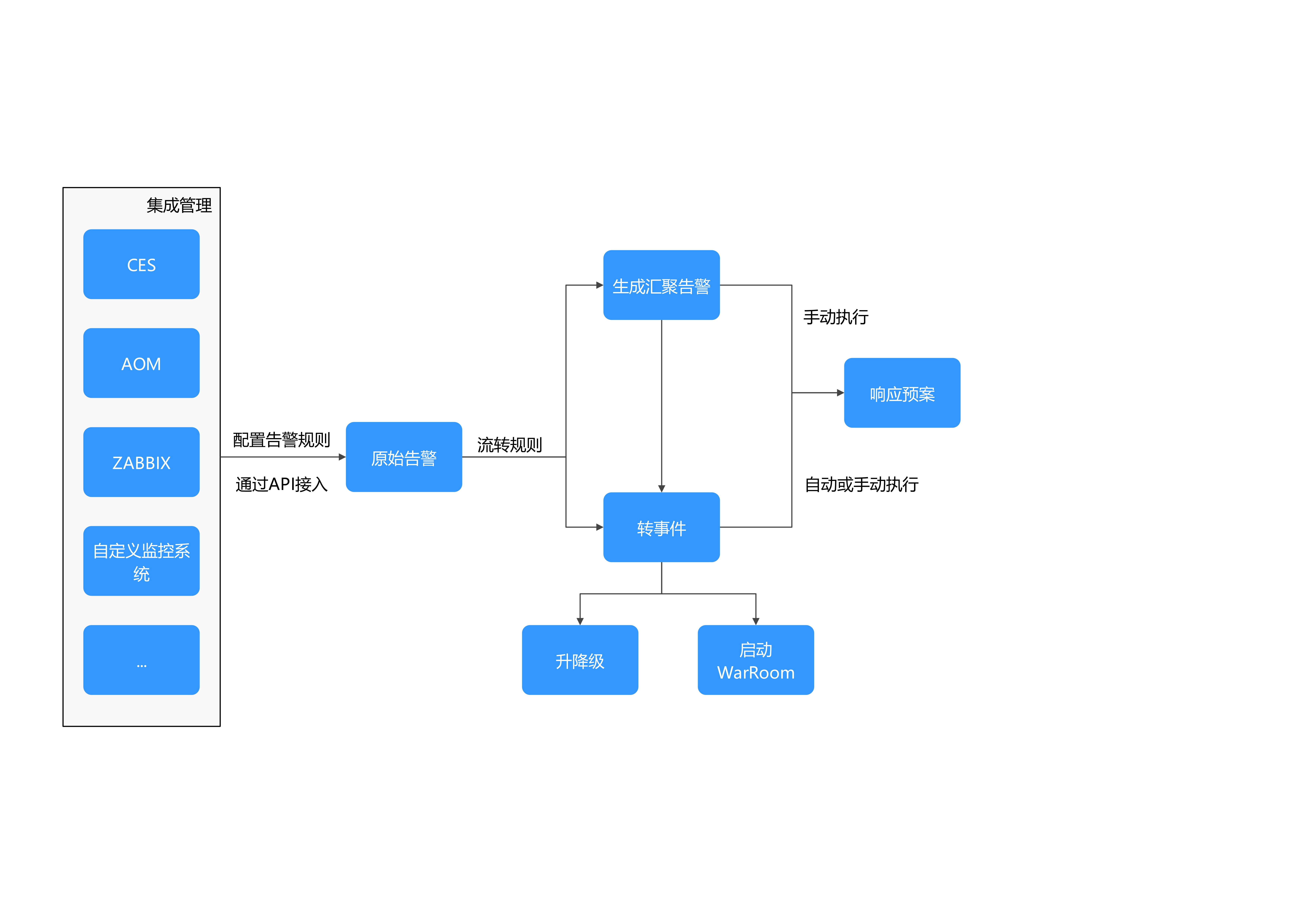 - 接入告警源,生成原始告警:支持集成多个现有或第三方等监控系统(比如CES、AOM、Prometheus),并将业务下分散的告警信息进行统一收集,生成原始告警。用户可以在集成管理处启用或禁用已有告警源,或者接入第三方监控系统。