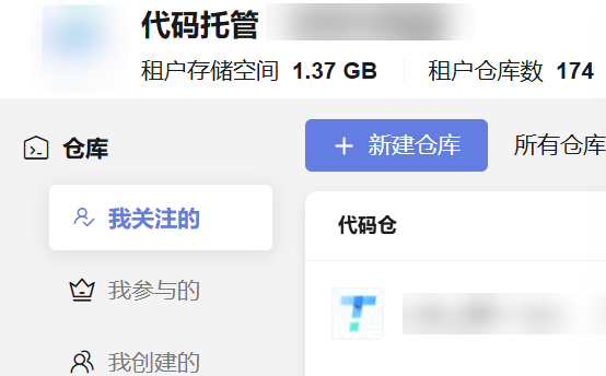 单击“立即使用”,进入代码托管服务首页。该页面展示的是与当前用户关注的仓库列表。