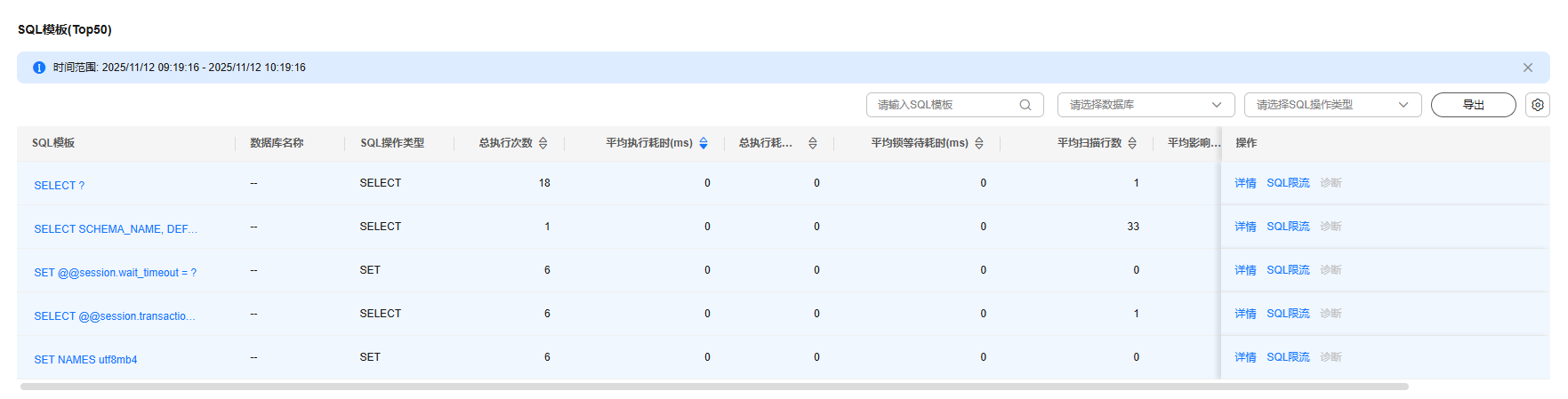 - 查看和导出SQL模板。例如数据库名称、SQL操作类型、总执行次数、平均执行耗时、平均锁等待耗时和平均扫描行数等。