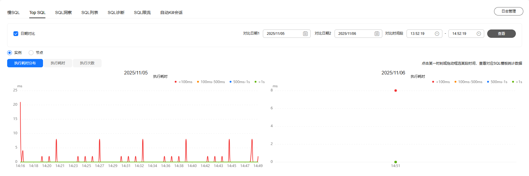 - 勾选页面左上角“日期对比”,可以对当前实例在不同天同一时间段内的TOP SQL分布情况进行对比分析。