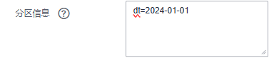单分区:year=2020,location=sun; 多分区:['year=2020,location=sun', 'year=2021,location=earth']. 前一日分区: day='${dateformat(yyyy-MM-dd HH:mm:ss, -1, DAY)}', |