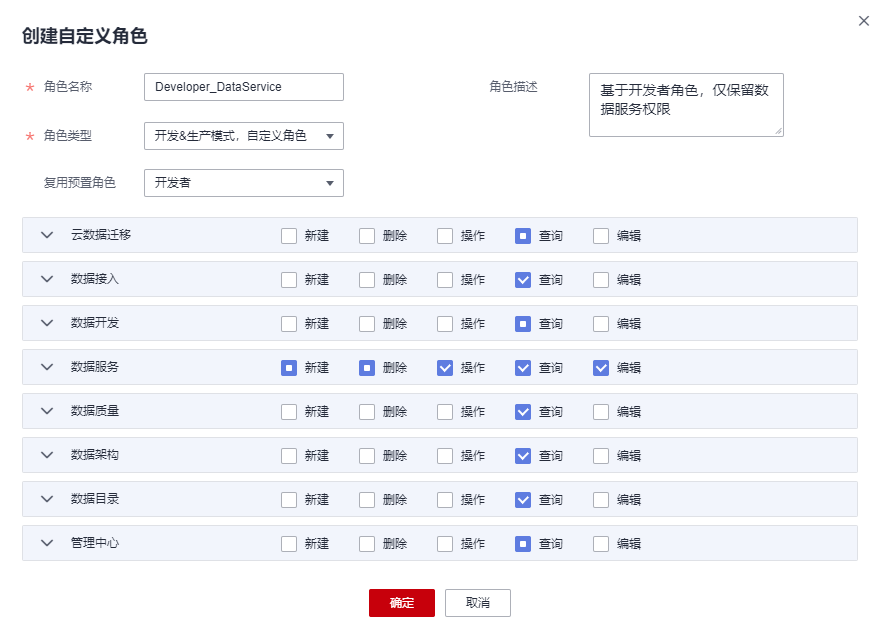 - 角色描述:补充对该角色的相关说明,此处填写为“基于开发者角色,仅保留数据服务权限”。