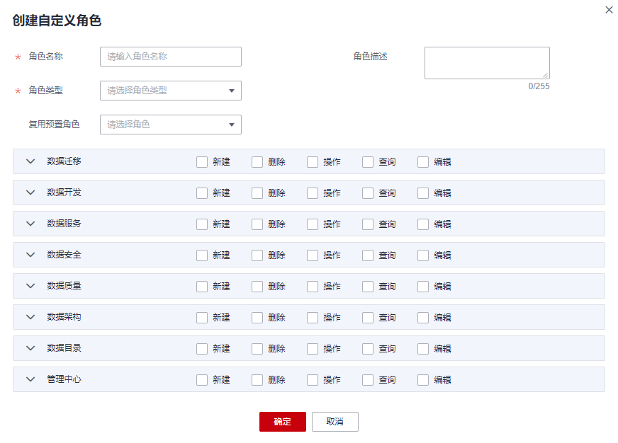 创建/编辑角色时,如果您当前账号已具备DAYU Administrator或Tenant Administrator权限,但系统仍然返回报错“您无权限进行该操作”,这可能是由于网络限制导致的,建议您切换到其他网络后重试。