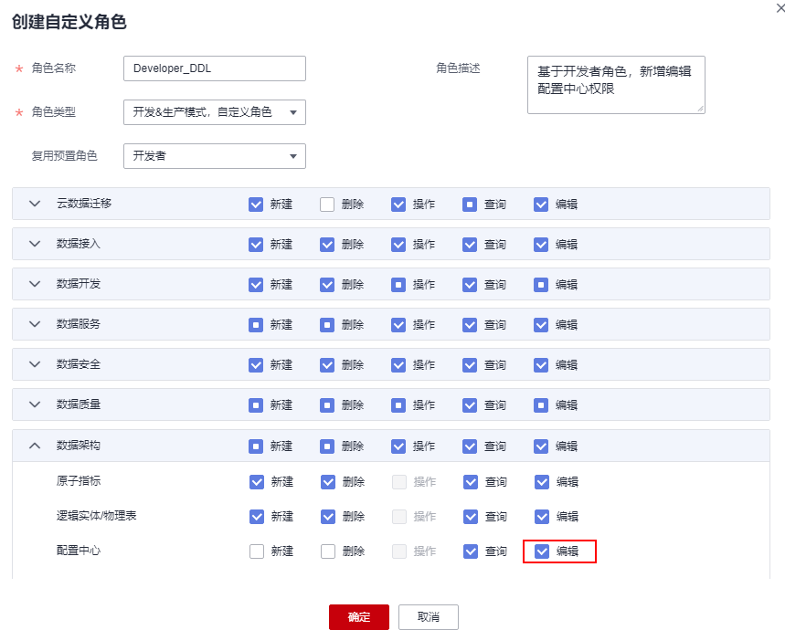 - 复用预置角色:选择“开发者”,然后勾选“数据架构 > 配置中心 >编辑”,为该角色授予编辑配置中心的权限。