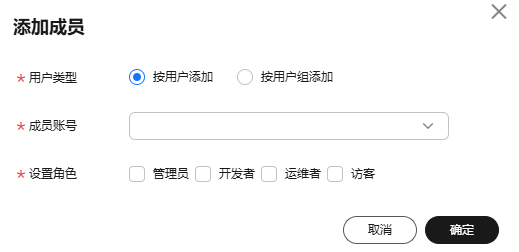 - 单击空间成员下的“添加”,在弹出的“添加成员”对话框中选择“按用户添加”或“按用户组添加”,然后从“成员账号”的下拉选项中选择用户或用户组,并设置角色。