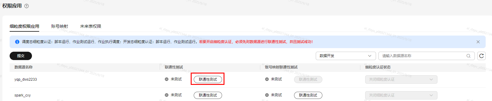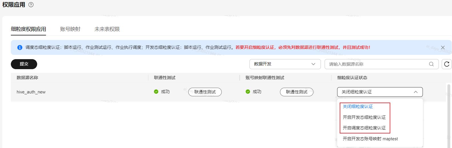 - 联通性测试成功后,在细粒度认证状态列,根据所需选择启用开发态或调度态的细粒度认证,然后单击下方的“提交”,即可开启细粒度认证。